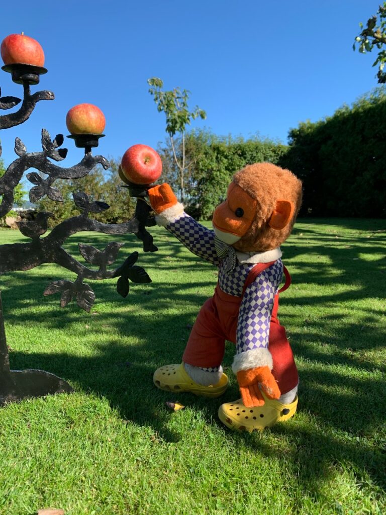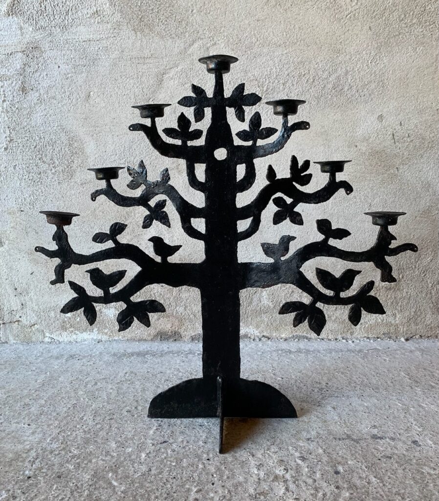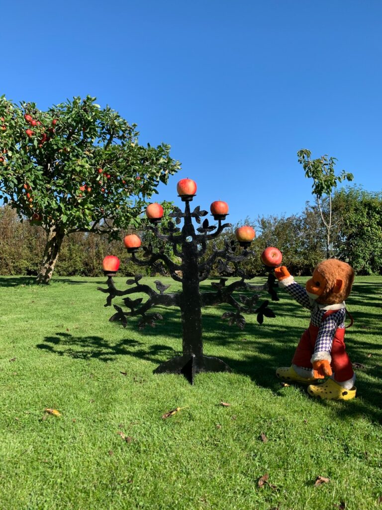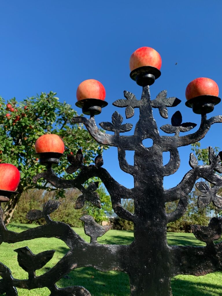 Vännen plockar äpplen från ”Livets träd” av Bertil Vallien. Detta är en pampig ljusstake i smide för värmeljus.