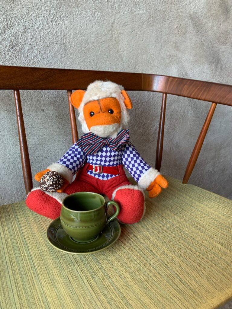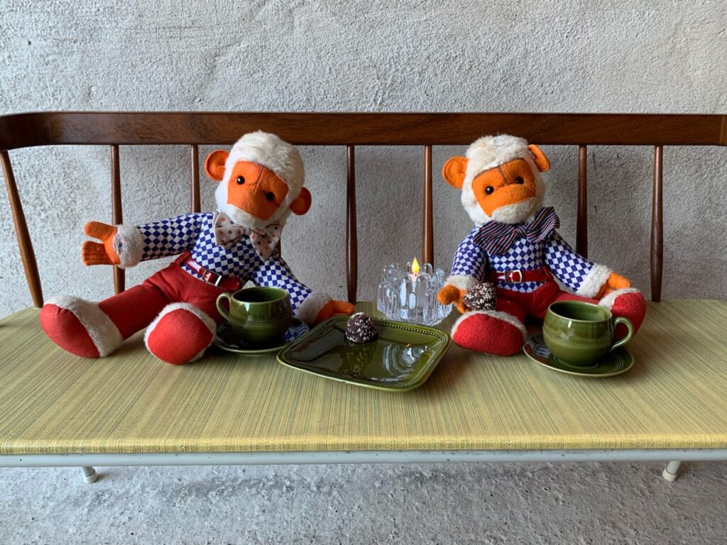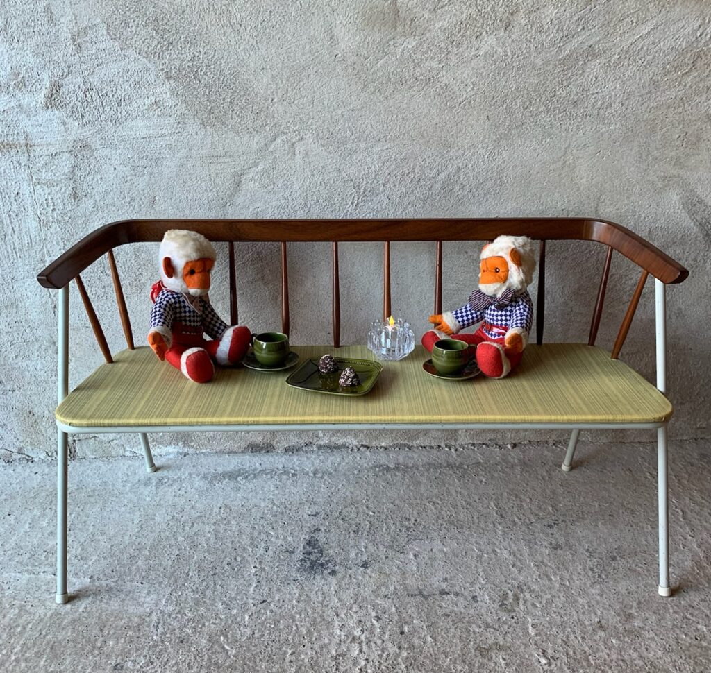 Här sitter vännerna och fikar i en retro pinnsoffa. Soffa 402 ur restaurangserien, Bjärnums slöjdfabrik AB, Bjärnum 1960-tal.