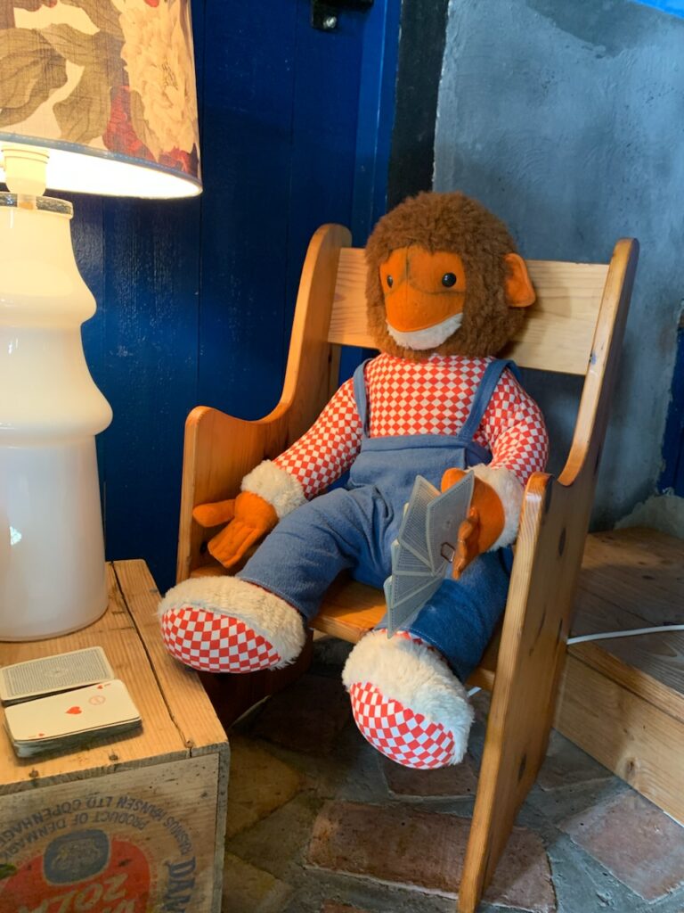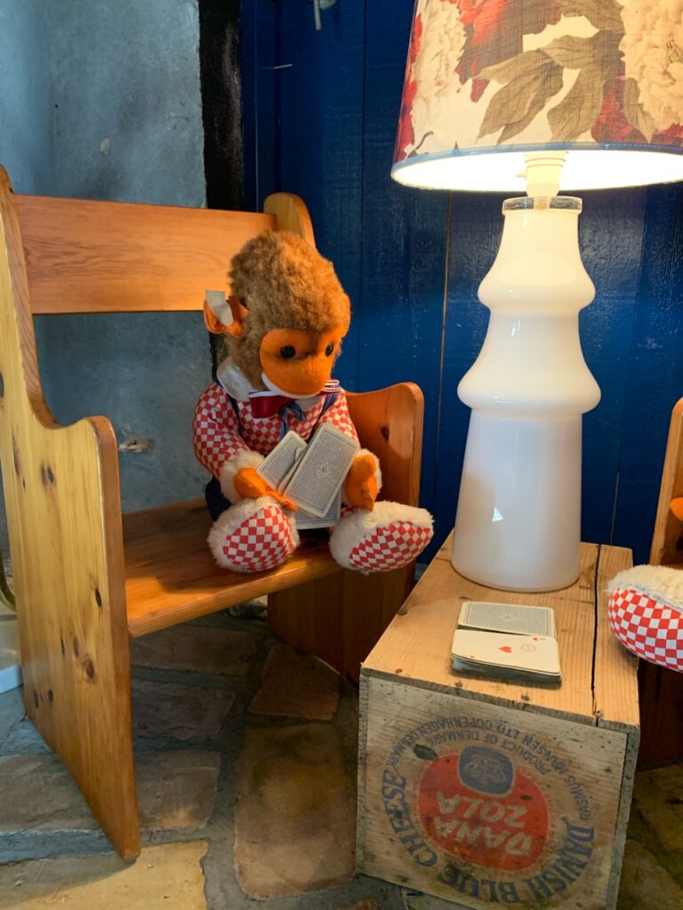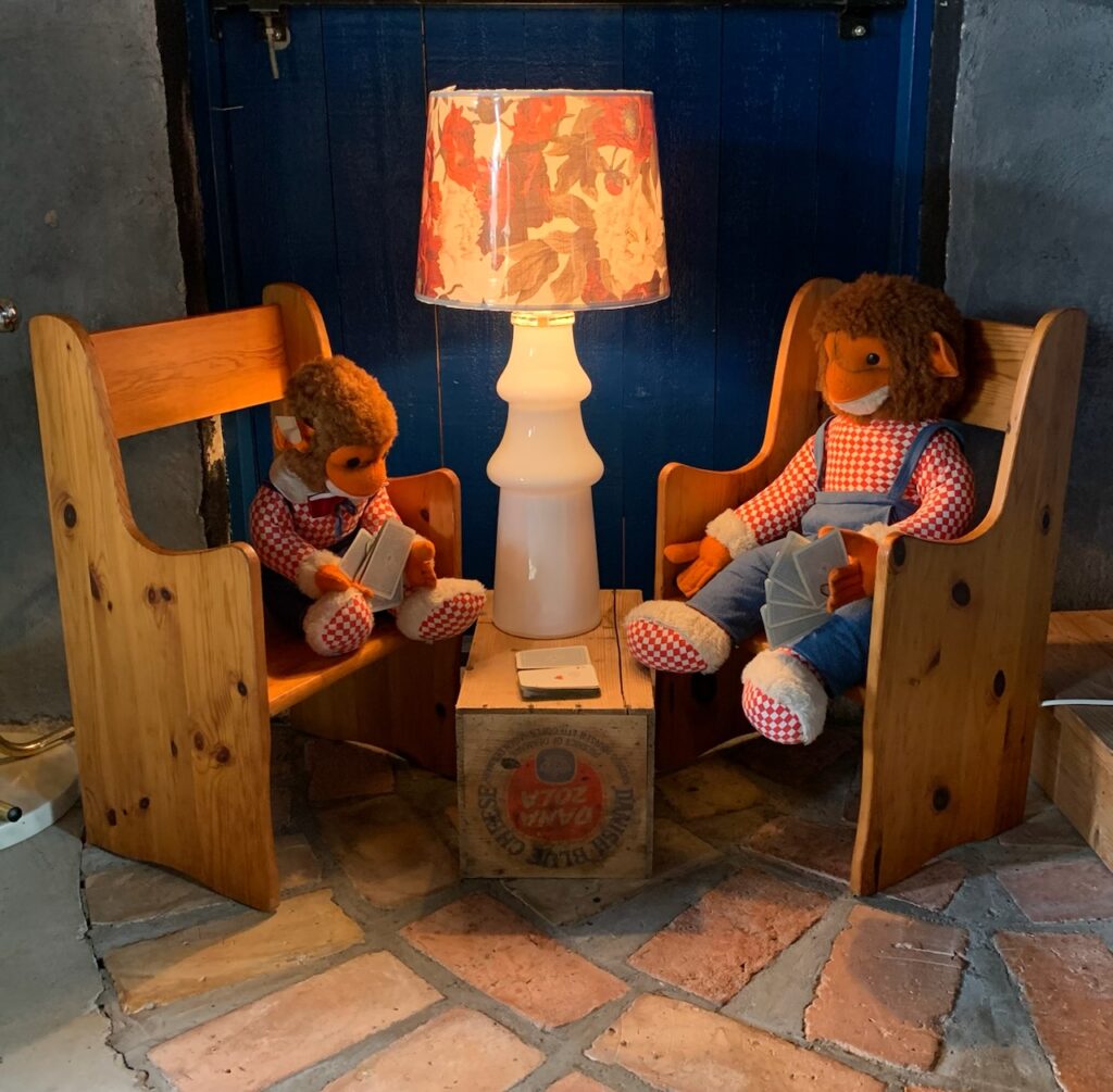 Här sitter vännerna och spelar kort i skenet från en ståtlig lampa i glas.