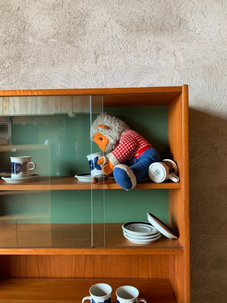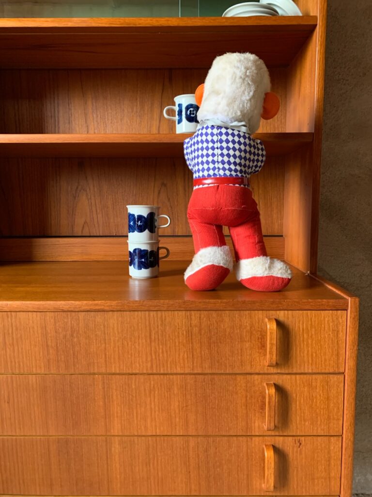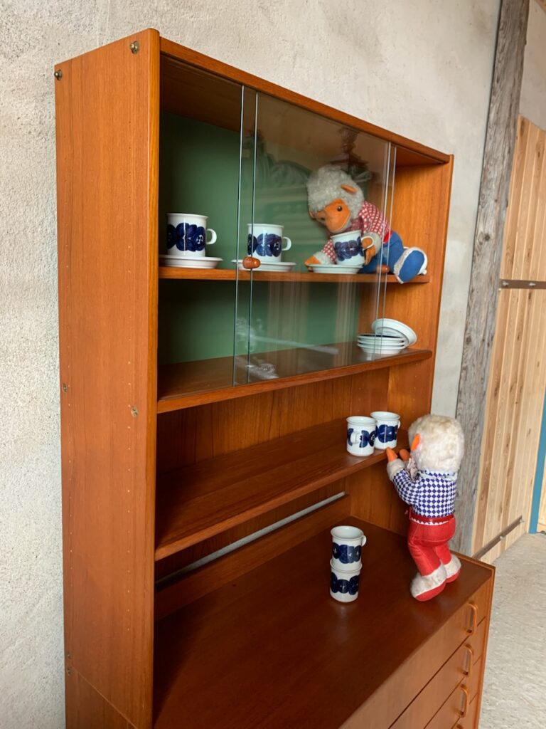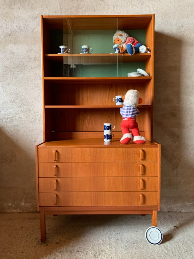 Nu har vi ställt in den här teakhyllan med vitrinskåp.
