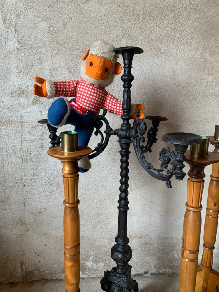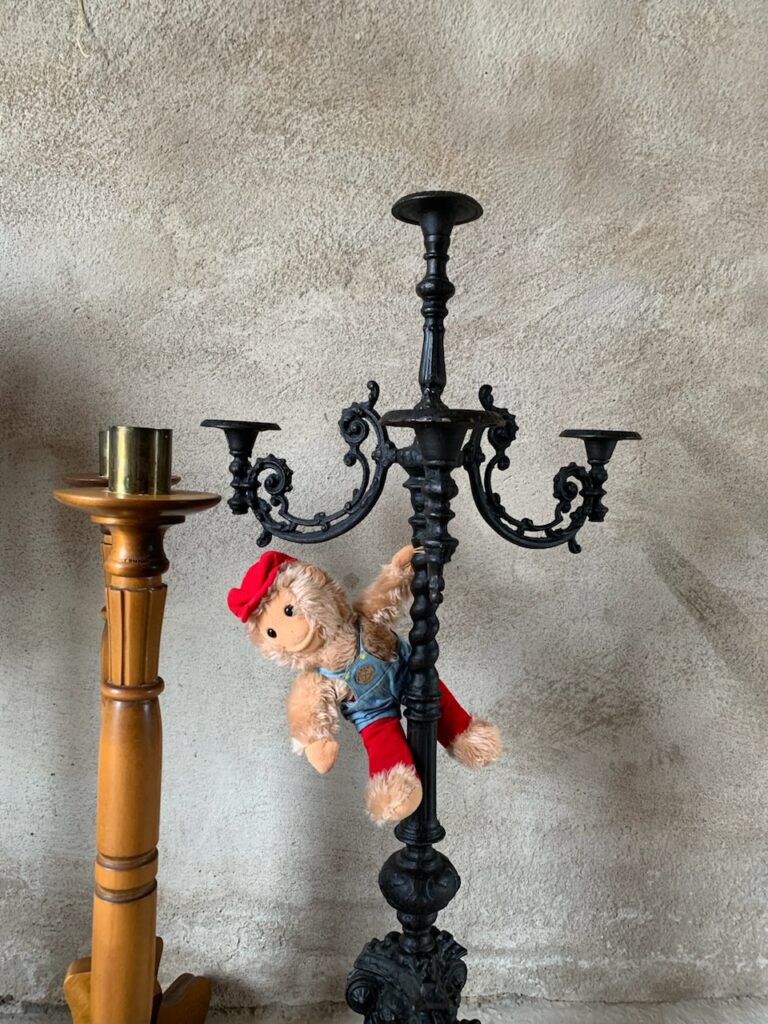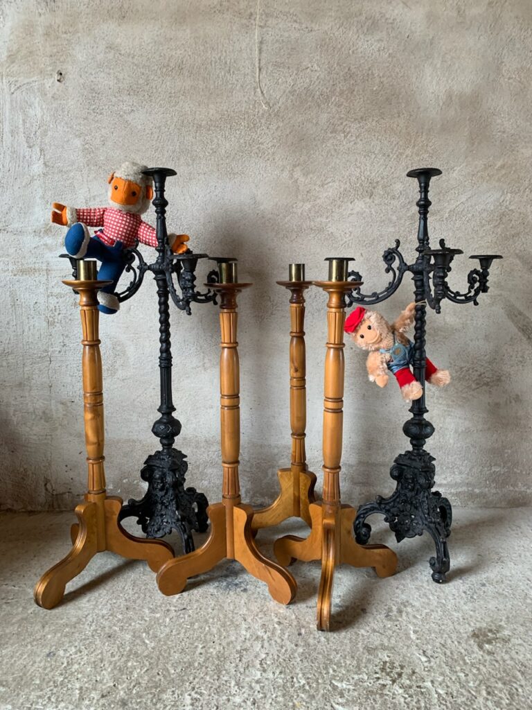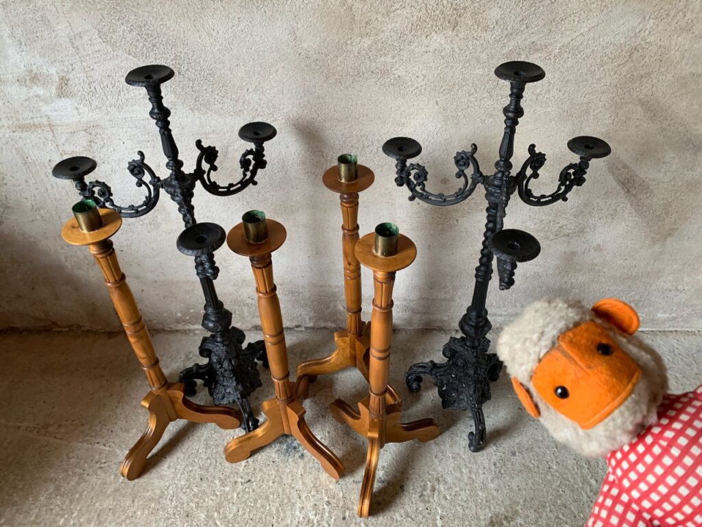 Här har vi ett gäng med golvljusstakar. De fyra i trä har stått i en kyrka och är från ca 1920-40-talet, de två i gjutjärn har stått på ett slott och är ca 20 år gamla.