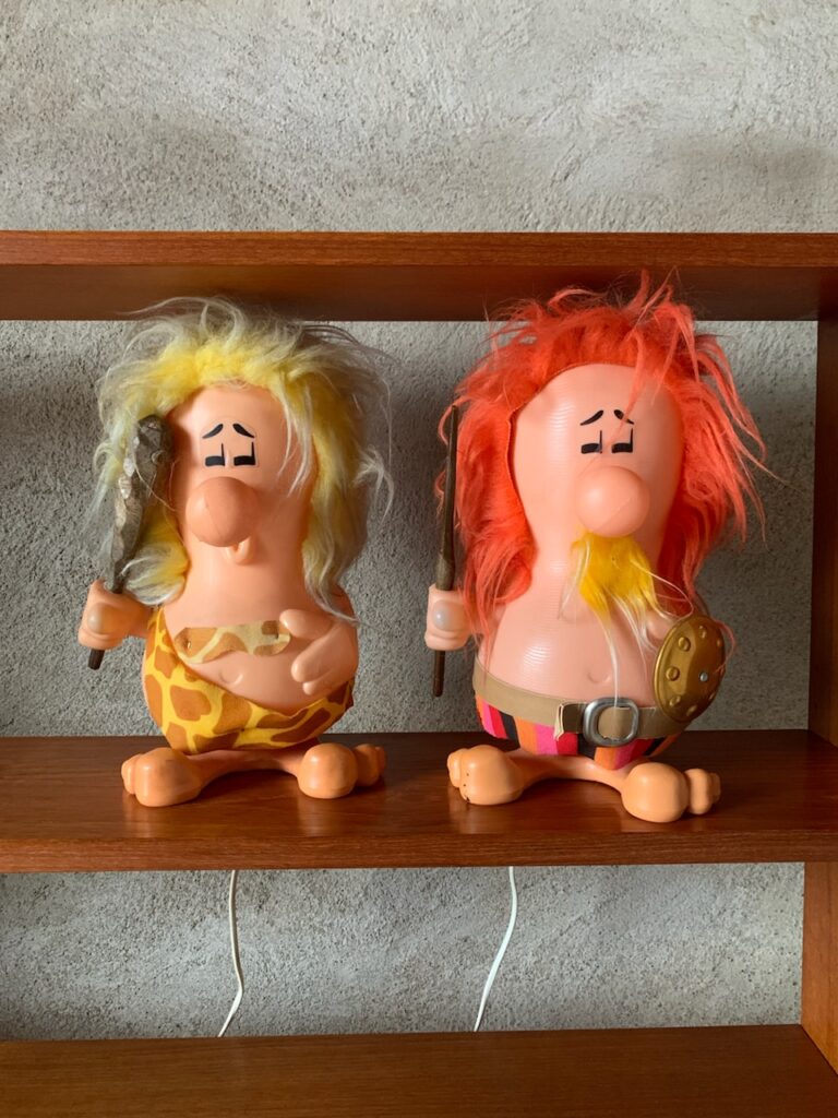 Två brun och vita retrolampor i plast. Lamporna är från 1970-talet och är i nyskick.