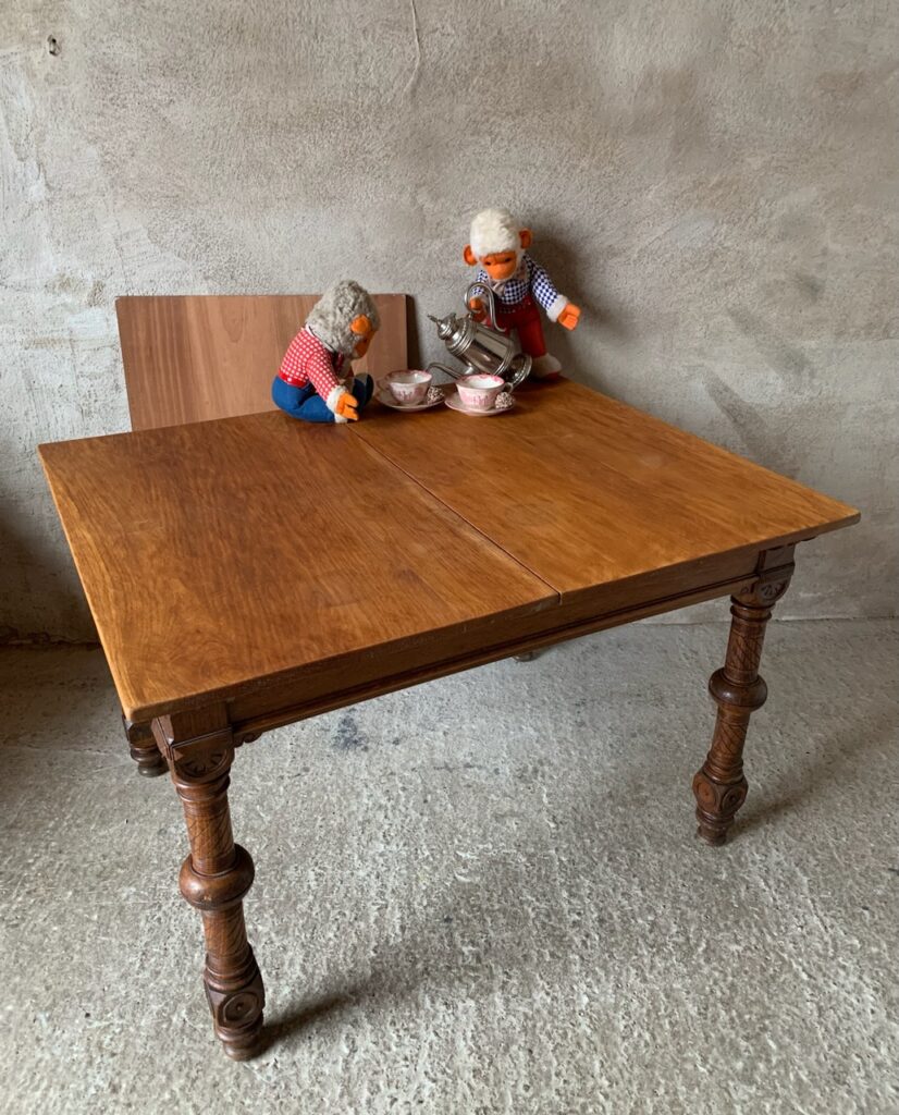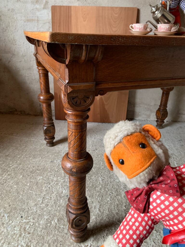 Ett vackert antikt matbord i ek, iläggsskivan är i ett annat träslag.