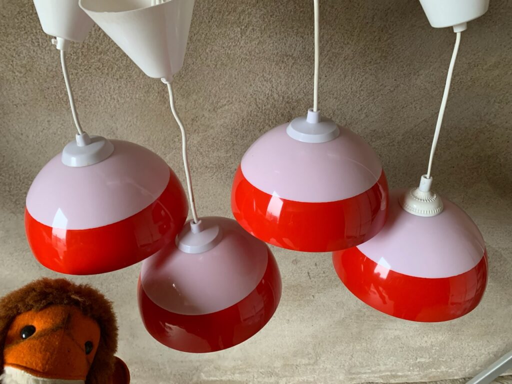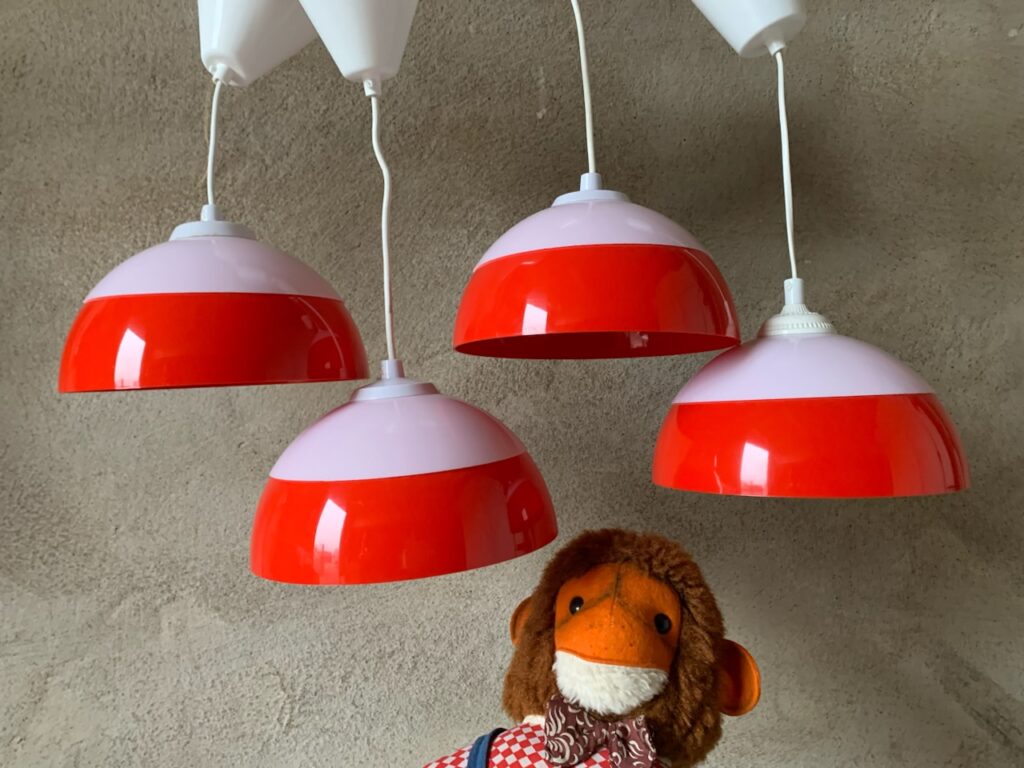 Här ser ni fyra stycken röda plastlampor från 1970-talet som är i nyskick.