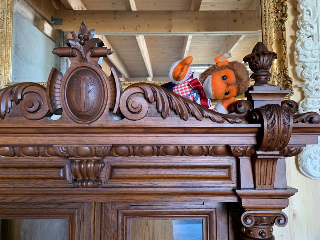 Det här skåpet har stått på Örenäs slott som färdigställdes 1918 uppfört av sockermagnaten Carl Tranchell. Skåpets krön är märkt med CT.