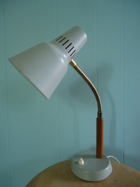 MBEL83 Publicerat den maj 13, 2014 vid 480 × 640 under Modern belysning SÅLD Grå skrivbordslampa med teakdetalj höjd 38 cm.