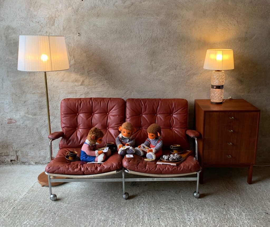 De sitter i en skinnsoffa ”Karin” formgiven av Bruno Mathsson för Dux.