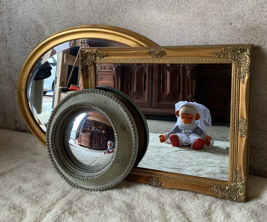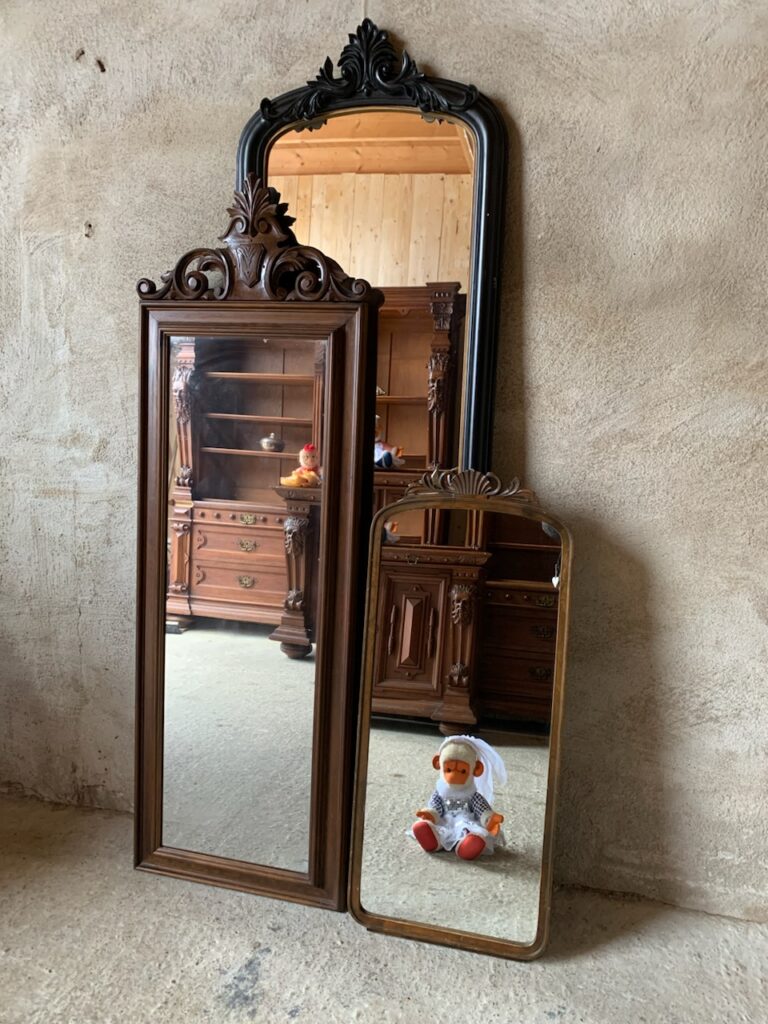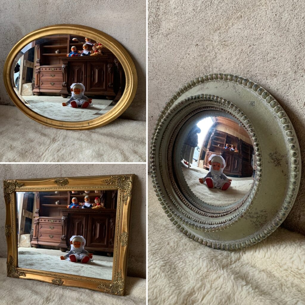 Ni hittar både antika speglar, retrospeglar och lite nyare speglar (inga helt nya eller nytillverkade utan alla är återbruk på något vis).
